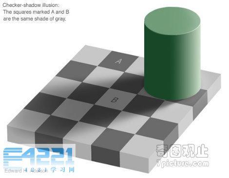 A方块和B方块的颜色是一样的。环境影响了你的感知,让你产生了错觉。不信的话,你可以用photoshop提取颜色。