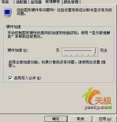 首先将屏幕状态切换到Windows 2003系统桌面上,然后用鼠标右击桌面的空白区域,从弹出的右键菜单中单击“属性”选项,打开系统的显示属性窗口;单击该窗口的“设置”标签,再在对应的标签页面中单击“高级”按钮,进入到高级显示属性设置界面;接下来再单击该设置界面中的“疑难解答”选项卡,并在其后出现的选项设置页面中,将“硬件加速”设置为“完全”,同时将“启用写入合并”选项(如图所示),并单击“确定”按钮,再将计算机系统重新启动一下,这样说不定就能将显卡驱动无法载入的故障顺利排除了。