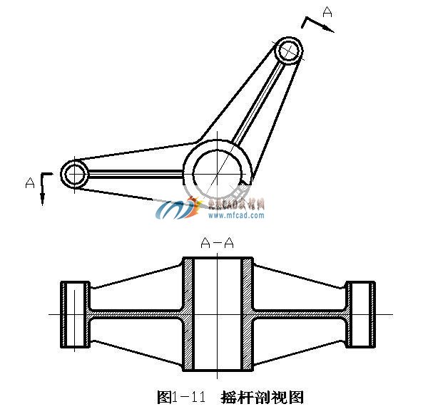 图中摇杆上的小孔仍按原位置投射,在剖视图上位椭圆。