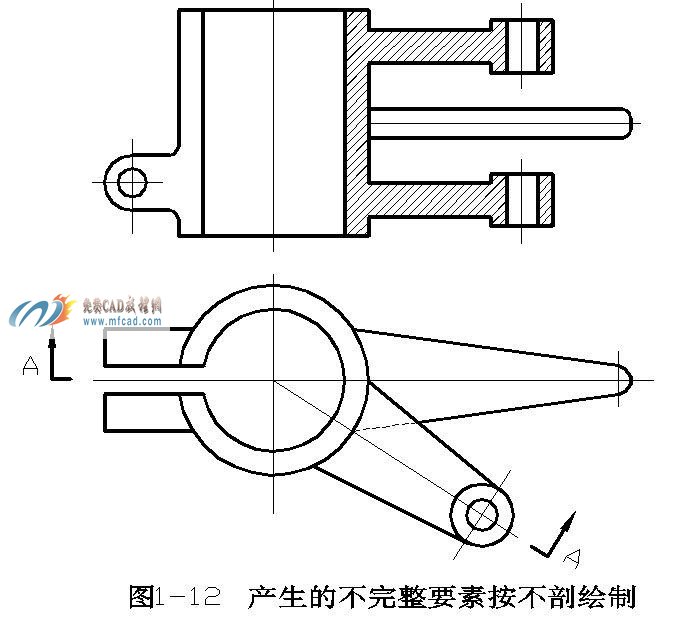 ③当剖切后会产生不完整要素时,应将次部分按不剖绘制。如图1-12中处于中间的臂按不剖绘制。