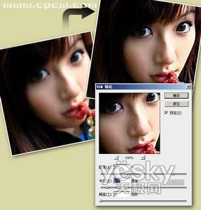 使用菜单“滤镜→锐化→USM锐化”弹出锐化对话框,在本例中我们设置较大的数量值,以取得更加清晰的效果,较小的半径值,以防止损失图片质量,最小的阈值,以确定需要锐化的边缘区域。