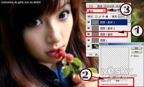3.设置图层混合模式为“叠加”,按“Ctrl+J” 快捷键复制图层,如果图像还有模糊现象,可以多复制几层叠加在上方。
