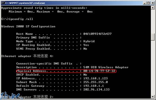 通过电脑DOS界面运行ipconfig/all这个命令会弹出如下类似信息,红线勾勒部分Physical Address对应的就是处于连接状态的网卡的MAC地址。