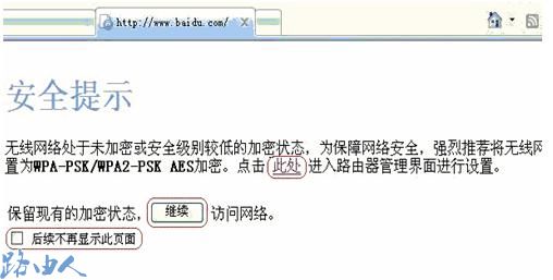 三、若当前无线设置加密类型为非WPA-PSK/WPA2-PSK AES 加密,打开网页时会弹出如下界面