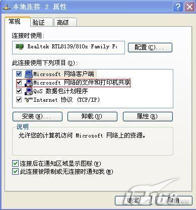 一、网上邻居→本地连接→属性里,检查是否安装了“Microsoft网络的文件和打印机共享”,图1。
