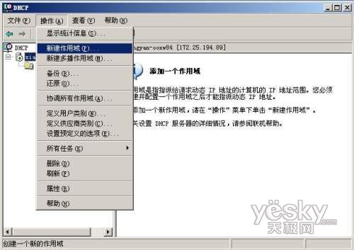 就像所有要建房先圈地的情况一样,使Windows Server 2003 服务器实现为网络中心的客户机动态分配IP地址的功能,要先为服务器创建一个作用域。创建作用域的主要作用是为服务器指定和配置好可分配的IP地址。因此在创建作用域前我们事先确定一段IP地址,如192.168.1.10~192.168.1.100等。
