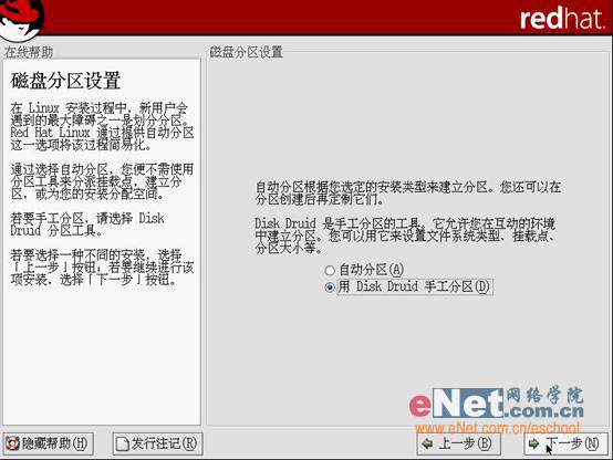 第七步:磁盘分区设置。其中包括两个选项, “自动”和“手动”。自动分区会将所有的整个硬盘按照容量大小平均分区格式化,适合没有装任何资料的新电脑,但如果你在这之前装有其他系统,或是其他分区中存在的数据的话,建议您还是“手动分区”,这样不会丢失您原来的文件数据。