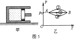 例5.如图5甲所示,固定在水平地面上的气缸内,用活塞封闭一定质量的理想气体,已知在环境温度变化时大气压强不变。现对活塞施加一作用力F,使气缸内气体分别经历图乙所示的①②③三个过程,缓慢地从状态A变化到状态B,状态A、B压强相等,则下列说法正确的是