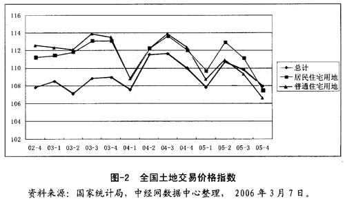 自2001年《国务院关于加强国有土地资产管理的通知》出台以来,土地资源配置逐步步入了以市场形成价格为核心,以经营土地招标、拍卖、挂牌、出让为表现形式的市场配置轨道。各地开始实行土地收购储备制度,土地出让的三种方式也得到了快速的发展。土地交易价格一路上升,如图-2所示,居民住宅用地和普通住宅用地的交易价格指数自2004年第四季度以来连续突破11O点。