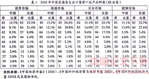 从1995年~1999年,中国到东盟的总出口商品中,制成品的比重从43.40%下降到32.97%,而半成品的比重从56.40上升到 67.19%,在东盟到中国的总出口商品中,制成品的比重也在下降,从40.53%变成37.16%,半成品比重从59.47%进一步增加到 62.84%。从中可以看出,在双方的贸易商品中,有一半以上是半成品,而且半成品的比重还在进一步增加。