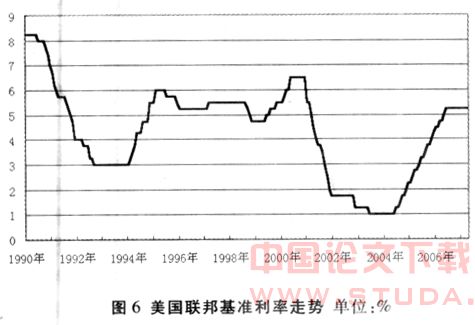低利率政策使美国房地产市场有了过度宽松的金融环境。伴随基础利率降低,按揭贷款利率也随着宽松的货币政策持续下降。30年固定按揭贷款利率从 2000年底的8.1%下调到2003年的5.8%;一年可调息按揭贷款利率也从2001年底的7.0%下调到2003年的3.8%。虽然在2004年6 月开始,美联储低利率政策开始逆转,连续调高利率,但此后一段时间内,按揭贷款利率仍然保持在较低的水平上。由于房屋贷款利率低,伴随着房价的不断上升,实际购房者每月偿付的贷款额并没有多大的升幅。
