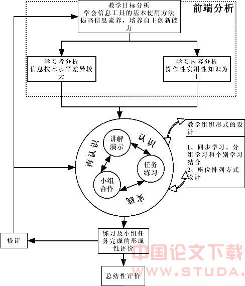 中学学信息技术课堂教学过程的设计要围绕教学目标,突出重点,突破难点,讲、练时间分配要合理;也可以相互穿插;要以学生为主体,引导他们先进行探索式实践,再把实践得到的知识运用到实践中去。可以把同步学习、分组学习、个别化学习相互结合,相互穿插,做到教师主导,学生主体的灵活结合,发挥教师的主导作用,调动学生的自主学习能力,培养学生的创新能力。要留足学生操作、讨论的时间;要灵活运用教师引导、自学探究、任务驱动等多种教学方法。切实做到师生互动、及时反馈。网络环境下的协作式学习,应成为信息技术课的主要学习方式,善于综合运用多种教学组织形式,使不同层次的学生都能得到提高。在分组安排练习或布置小组任务时,最好要兼顾到不同层次学生的学习需要,要注意其差异性要充分发挥学有所长的学生的积极作用[3]。