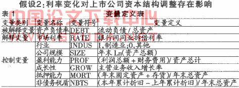 (一)国外文献当najan和Zingales(1995)以及Demirguc—Kun和Maksimovic(1999)等将研究对象扩展到发展中国家时,结果发现,尽管在多数资本结构模型中宏观经济变量没有起到任何作用,但宏观经济环境的差异对所有模型提出了严峻的考验。近年来,wald(1999)、Booth等(2001)对不同国家企业资本结构的比较研究进一步拓展了资本结构理论的内涵。他们的研究发现,资本结构与一国的制度环境、宏观经济因素、公司特征因素密切相关。利率水平包含了大量宏观经济信息,并且是资金信贷市场中资金使用权的转移价格,企业筹资离不开对市场利率的分析权衡。国外,Kim,Ramaswamy和Sundaresan(1993)以及Longstaf和ISchwartz(1995)都认为,企业的负债率随着无风险利率的增加而增加,主要是因为在风险中性框架内,无风险利率增大,导致违约率下降。Ieland(1998)以及Leland和Tdif(1996)发现,当无风险利率增加时,所有资产的回报率都增大了,违约概率降低了,从而增大了公司的负债能力。Russo等(1999)认为由于利率使负债融资成本增加,所以利率上升使权益融资更有吸引力。实证研究结果得到,对经理无权利的合作社,利率对资本结构有显著影响,因为该类合作社更关心利息费用增加导致的边际利润减少。Bancel(2002)分析欧洲17个国家的公司资本结构的影响因素时得到,利率水平是经理考虑企业负债政策的重要因素,并且通常是利率较低的情况下,企业采用负债融资。Huang,Ju和Ou—Yang(2003)认为,利率的变化影响着企业的负债比率。