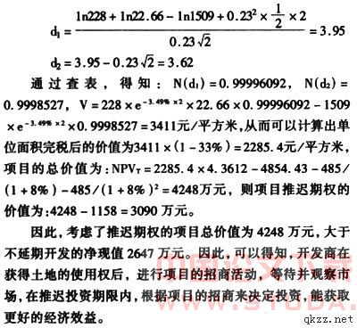 因此,考虑了推迟期权的项目总价值为4248万元,大于不延期开发的净现值2647万元。因此,可以得知,开发商在获得土地的使用权后,进行项目的招商活动,等待并观察市场,在推迟投资期限内,根据项目的招商来决定投资,能获取更好的经济效益。