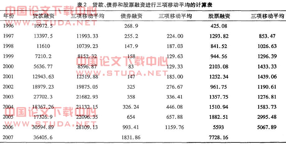 4.理论假设:不规则变动是由偶然的随机因素所引起的。若从—个较长时期看,则各种偶然因素的随机因素所形成的偏差会相互抵消。故本文采用移动平均法一三项移动平均进行数据修匀来测定融资偏好的长期趋势。
