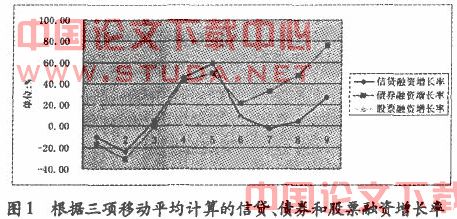 由表1可以看出,贷款融资和债券融资的增长速度大致相同,只是在前期,贷款融资上升和下降的幅度都比债券融资的要大,但在后期,贷款融资上升的幅度大大低于债券融资。这说明,债券市场的融资能力有所增强。股票的增长速度几乎与前两者是相反的,在后期有几年,三者的增长线是一致的,都是上升的,股票融资的增长还超过前两者的增长,但最后一期,股票融资没有继续增长,而是下降。三者增长的变化,基本上和表2的分析结论一致。