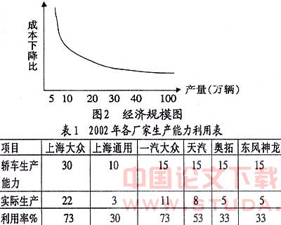 (2)生产能力达到规模经济,但生产能力开工不足。中国汽车企业在设计产量上均达到汽车组装线的最佳规模产量,但普遍实际产量未能达到规模经济点.截止2002年底,中国已建成具有年产各种汽车300万辆(其中:轿车年产120万辆)的生产能力,但2002年只生产各种汽车206万辆,占生产能力的68.6%,轿车产量60万辆,占生产能力的50%,汽车企业生产能力严重未饱和(见表1),这直接导致车均固定成本无法大幅度下降。而汽车工业是规模经济显著的行业,对生产成本影响最大的还是生产批量,如果规模产量增长或实际产量达到工作设计年生产纲领,产品价格下调是必然的趋势。