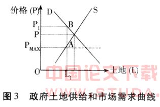 而当政府以土地供应者的身份面对市场需求的时候,政府又会以卖方垄断的身份出现在市场中。因而就会出现如图3所示的情况。图3说明,图2中的需求曲线D随着政府由需求者转为供给者而转为供给曲线S,其形状也发生变化。主要有以下两点:一是图2中A点右边的供给曲线因市场价格的影响(最高限价下也是有利可图的:按耕地被征前若干年庄稼的价值来确定补偿被征土地的价格与市场价格相去甚远。)不再是水平的,而向右向上方倾斜;二是由于土地的稀缺和政府的控制而使得供给曲线S更陡峭,其弹性远远低于图2中曲线D中OA那一段的弹性。另外由于政府具有对土地的控制权,所以土地价格不可能停留在市场出清的价格P上,会上升至B点,价格达到P1,此时需求大于供给。