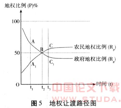 假如地权归农民,图4中的Dg曲线就会消失,农民利益就会得到充分地保证。所以,是利益限制了地权的让渡。地权让渡的实质是让渡利益。这样看来,如果实现了利益的让渡,即使地权不归农民,也是无关紧要的。但事实和理论证明没有地权的让渡,就不可能保证利益让渡的长效性。为长期保证农民利益,就必须实现地权让渡。不过由于地权让渡过程的长期性,地权让渡在其运行过程中表现为利益的逐渐让渡。利益变化是整个让渡的运行过程是否正确合理的主要指标。