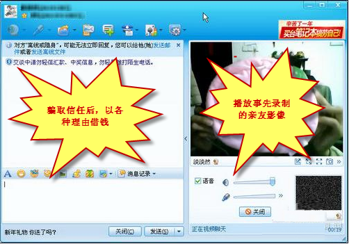近期,腾讯公司接到用户举报,反映有不法分子利用“QQ视频”进行钱财诈骗。以往,不法分子通常盗取用户QQ号,再与用户的好友文字聊天、取得信任,然后骗取钱财。与文字聊天诈骗相比,这种新型的视频诈骗方式更加隐蔽,关键是有亲友聊天的真人视频画面迷惑,于是未经和亲友电话确认,匆匆汇款从而落入圈套。在此提醒广大用户留意分辨以免造成损失。