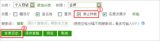 为了保护日志原作者文章的权益,原作者本人在发表日志时可以设置,日志不让他人转载的功能。设置成功后,他人在浏览该篇日志没有转载的铵钮。设置日志禁止转载的操作步骤如下:
